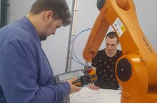 Студент группы 521 специальность Информационные системы и прграммирование Волков Сергей и выпускник Колледжа , работник филиала АО Сетевая компания Нижнекамские электрические сети Закиров Динар начали подготовку по компетенции "Промышленная робототехника" в рамках республиканского этапа Всероссийского движения Абилимпикс.