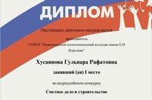 От всей души , от имени коллектива Политехнического колледжа имени Е.Н.Королёва поздравляю выпускницу колледжа, ныне преподавателя строительных дисциплин Хусаинову Гульнару Рафатовну -1 место во Всероссийском конкурсе "Сметное дело в строительстве".