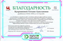 Благодарность Куприяновой Татьяне Адиславовне от директора АНО "Детский технопарк Кванториум" за плодотворное сотрудничество и активную работу в сфере развития научнотехнической и инновационной деятельности студентов в Республике Татарстан. 23.06.2021