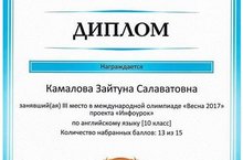 Поздравляем победителя (диплом 3 степени) студентку колледжа Камалову Зайтуну-участницу Международной олимпиады "Весна-2017" проекта "Инфоурок" по английскому языку.