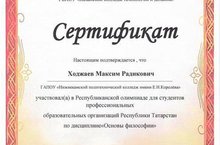 Со времен рождения древнегреческой философии мудрецами считались те, кто мог не только излагать собственные мысли правильно и стройно, но и пытался объяснить закономерный ход развития окружающей действительности. Студент колледжа Ходжаев Максим (преподаватель Муллагалиева Т.С.) принял участие в Республиканской олимпиаде для студентов ПОО РТ по дисциплине "Основы философии", где показал что любовь в философии это любовь к мудрости.