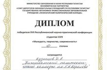 Поздравляем студентку группы 251 Мубаракшину Ралину, занявшую III место в Республиканской студенческой научно-практической конференции «Наука, современное производство и профессиональное образование»
