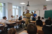 Ренат Владимирович напомнил ребятам о важности знаний и навыков, необходимых для предотвращения несчастных случаев и сохранения жизни и здоровья в любой ситуации, напомнил телефоны вызова экстренных служб - 101 и 112, познакомил с историей возникновения гражданской обороны.