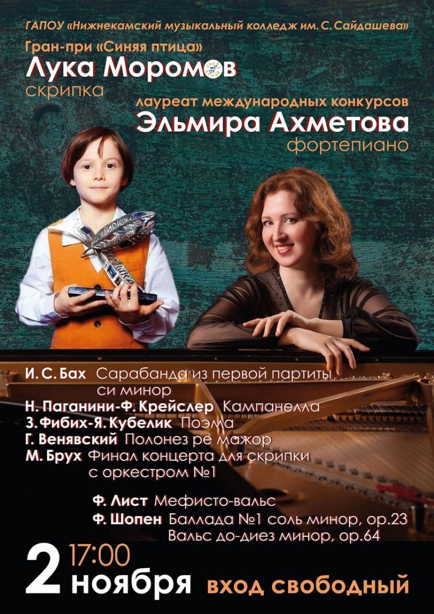 Опубликовано: 02.11.2024Друзья, 2 ноября в концертном зале Нижнекамского музыкального колледжа имени С. Сайдашева пройдёт концерт уже знакомого нашей публике юного гостя из г. Набережных Челнов - победителя юбилейного X Всероссийского телевизионного конкурса «Синяя птица», стипендиата фонда «Новые имена» ЛУКИ МОРОМОВА и Лауреата международных конкурсов Эльмиры Ахметовой. ВХОД СВОБОДНЫЙ