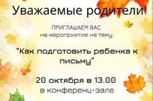 Уважаемые родители, 20.10.2022 состоится встреча родителей с логопедами Центра на тему "Как подготовить ребенка к письму". На встрече вы сможете увидеть видео-презентацию с полезными упражнениями, мастер-класс "как заниматься с ребенком дома". Будем вам рады!