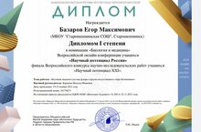 Поздравляем победителя! 24.11.2021Поздравляем нашего воспитанника Базарова Егора, (педагог Баранова Н.И.), занявшего 1 место во Всероссийской онлайн-конференции учащихся "Научный потенциал России" в финале Всероссийского конкурса научно - исследовательских работ учащихся "Научный потенциал - XXI".Желаем дальнейших успехов и новых побед!