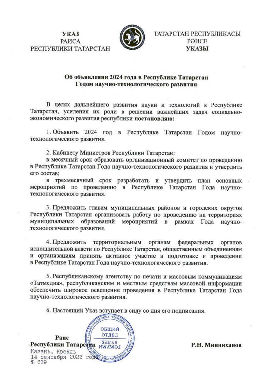 2024 год объявлен в Республике Татарстан Годом научно-технологического развития