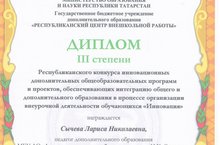 Поздравляем нашего коллегу - педагога дополнительного образования СЫЧЕВУ ЛАРИСУ НИКОЛАЕВНУ с победой - Диплом 3 степени Республиканского конкурса инновационных дополнительных общеобразовательных программ и проектов