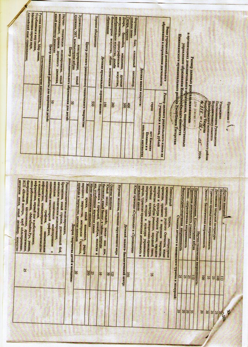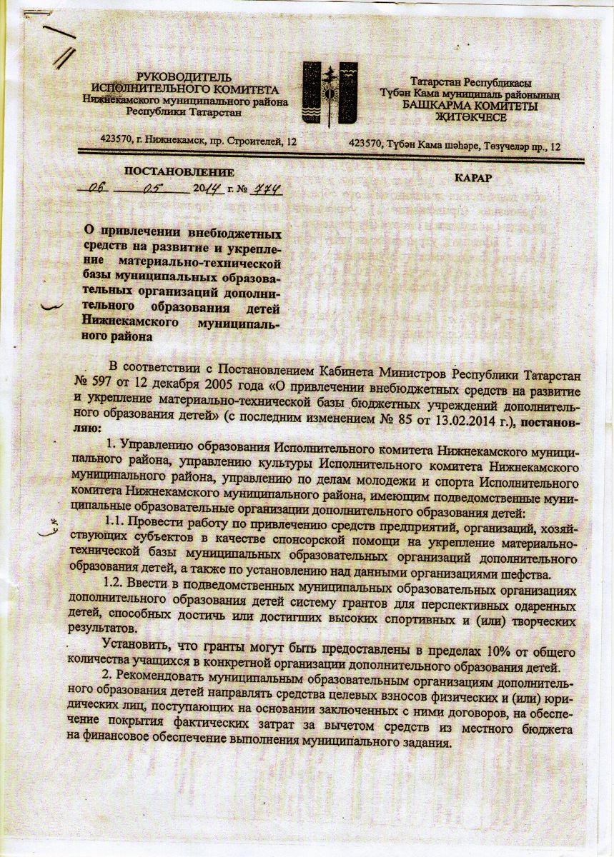 Постановление о привлечении внебюджетных средств на развитие и укрепление материально-технической базы муниципальных образовательных организаций дополнительного образования детей Нижнекамского муниципального района. Постановление №774 от 06.05.2014 года