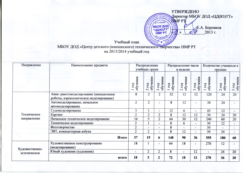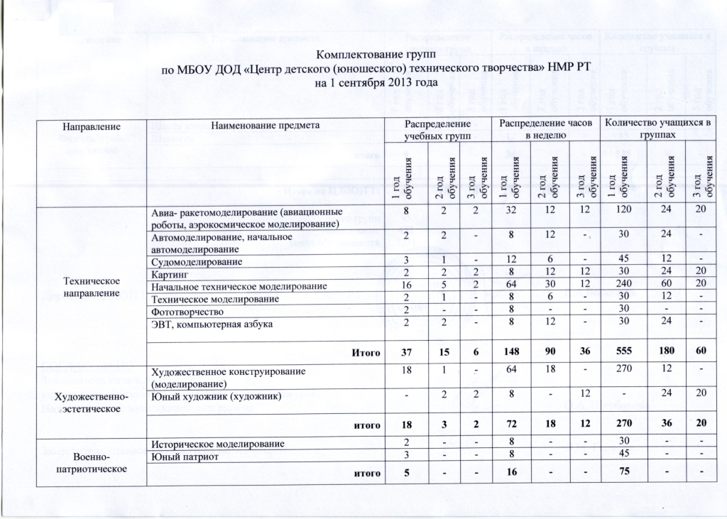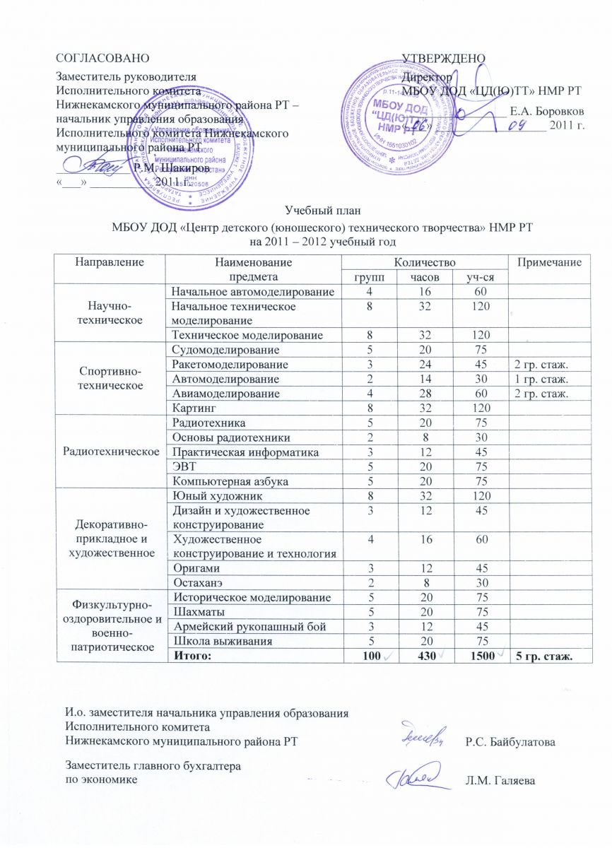 Учебный план МБОУ ДОД ЦД(Ю)ТТ НМР РТ на 2011-2012 учебный год