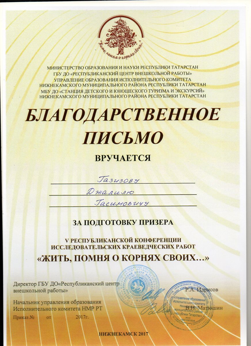 2017 Благодарственное письмо Газизов Д.Г. "Жить п, помня о корнях своих".jpg