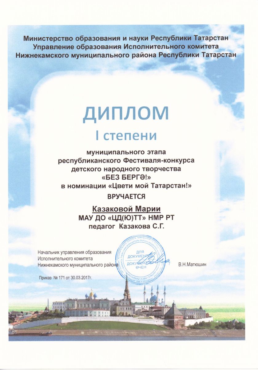 Диплом 1 степ Казакова Мария ПДО Казакова 3 муниц эт Без берге 2017.jpg