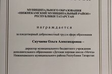 Высокая награда! или Награда за труд в образовании! ПОЧЕТНОЙ ГРАМОТОЙ МУНИЦИПАЛЬНОГО ОБРАЗОВАНИЯ «НИЖНЕКАМСКИЙ МУНИЦИПАЛЬНЫЙ РАЙОН»РТ награждается Скучаева Ольга Александровна - директор «Детской хоровой школаы«Мечта» НМР РТ за плодотворный добросовестный труд в сфере образования! От всей души поздравляем нашего уважаемого директора, Ольгу Александровну, с этой заслуженной и высокой наградой! Эта почётная грамота – признание вашего профессионального мастерства, неустанной энергии, преданности делу воспитания и обучения юных талантов, а также огромного личного вклада в развитие нашей хоровой школы "Мечта". Ваше руководство, мудрость и любовь к своему делу вдохновляют весь коллектив и наших учеников! Желаем вам крепкого здоровья, неиссякаемого вдохновения, новых творческих свершений и дальнейших успехов в вашей важнейшей работе на благо нижнекамского образования! Мы гордимся вами!