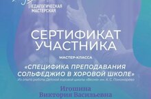 Сертификат участника МАСТЕР-КЛАССА «СПЕЦИФИКА ПРЕПОДАВАНИЯ СОЛЬФЕДЖИО В ХОРОВОЙ ШКОЛЕ»из опыта работы Детской хоровой школы «Весна» им. А. С. Пономарёва получила Игошина Виктория Васильевна.