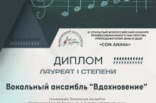 От души поздравляем вокальный ансамбль преподавателей «Вдохновение»( руководитель Игошина В.В, концертмейстер Долгополова В. П) Коллектив стал Лауреатом 1 степени в III Открытом всероссийском конкурсе профессионального мастерства преподавателей ДМШ и ДШИ « CON ANIMA»