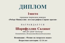 Шарифуллин Салават занял первое место в номинации "Чтение на татарском языке" на конкурсе "Роберт Миннуллин: веселые рифмы и яркие краски" 20.05.2025