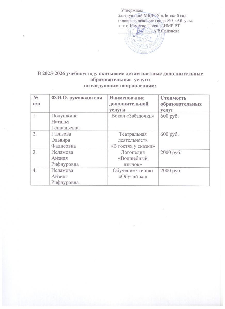 С 01.10.2025 г. МБДОУ №5 "Айгуль"организует работу платных дополнительных образовательных услуг: