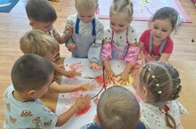 Малыши- юные художники, вдохновлённые красками осени, нарисовали осеннее дерево , использовав вместо кисточки свои маленькие ладошки