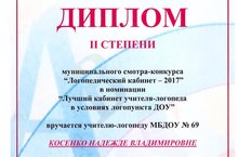Поздравляем Косенко Надежду Владимировну, которая получила диплом 2- степени в муниципальном смотре-конкурсе "Логопедических кабинетов -2017", в номинации "Лучший кабинет учителя-логопеда в условиях логопункта"