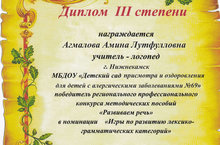 Поздравляем Агмалову Амину Лутфуловну – учителя – логопеда, которая стала победителем регионального профессионального конкурса методических пособий « Развиваем речь» в номинации « Играем по развитию лексико-грамматических категорий» была награждена дипломом III степени.