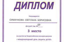 За участие во Всероссийском конкурсе рисунка "МЕЖДУНАРОДНЫЙ ДЕНЬ ЗАЩИТЫ ДЕТЕЙ" детский сад занял 3 место.