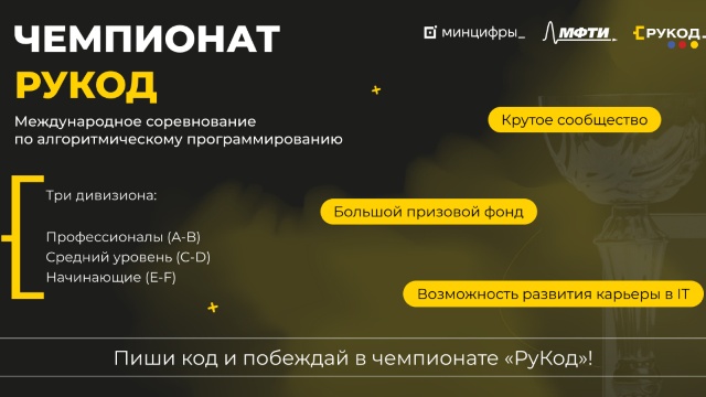 Опубликовано: 22.07.2025Международный чемпионат по алгоритмическому программированию «РуКод» — это возможность проверить свои знания в области алгоритмов, получить дополнительные баллы на ЕГЭ или усилить своё портфолио, а также побороться за призы. Чтобы присоединиться к соревнованию, подайте заявку на Госуслугах https://www.gosuslugi.ru/landing/RuCode