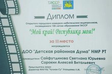 В рамках празднования 100-летия ТАССР в первых числах сентября состоялся открытый городской конкурс любительских видеороликов "Мой край! Республика моя!" Активисты Детской районной Думы под руководством заведующей отделом Сайфутдиновой Светланы Юрьевны и методиста Сорокина Алексея Витальевича стали обладателями почетного второго места!
