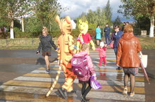 Дети в костюмах сказочных героев Винни-Пуха и Тигры переводили первоклассников через оживленные пешеходные переходы вблизи учебных заведений, объясняя им правила дорожного движения.
