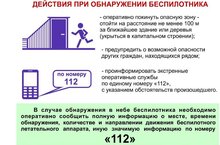 Проинформировать экстренные службы по единому номеру «112» с указанием обстоятельств произошедшего (место, время обнаружения, количестве и направлении движения БПЛА)