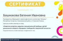 12 сентября педагог дополнительного образования, руководитель образцового хореографического коллектива "Импульс" приняла участие в онлайн-семинаре на тему "Развитие актерских навыков и эмоциональной свободы у детей дошкольного возраста. Фундамент свободной и творческой личности". -