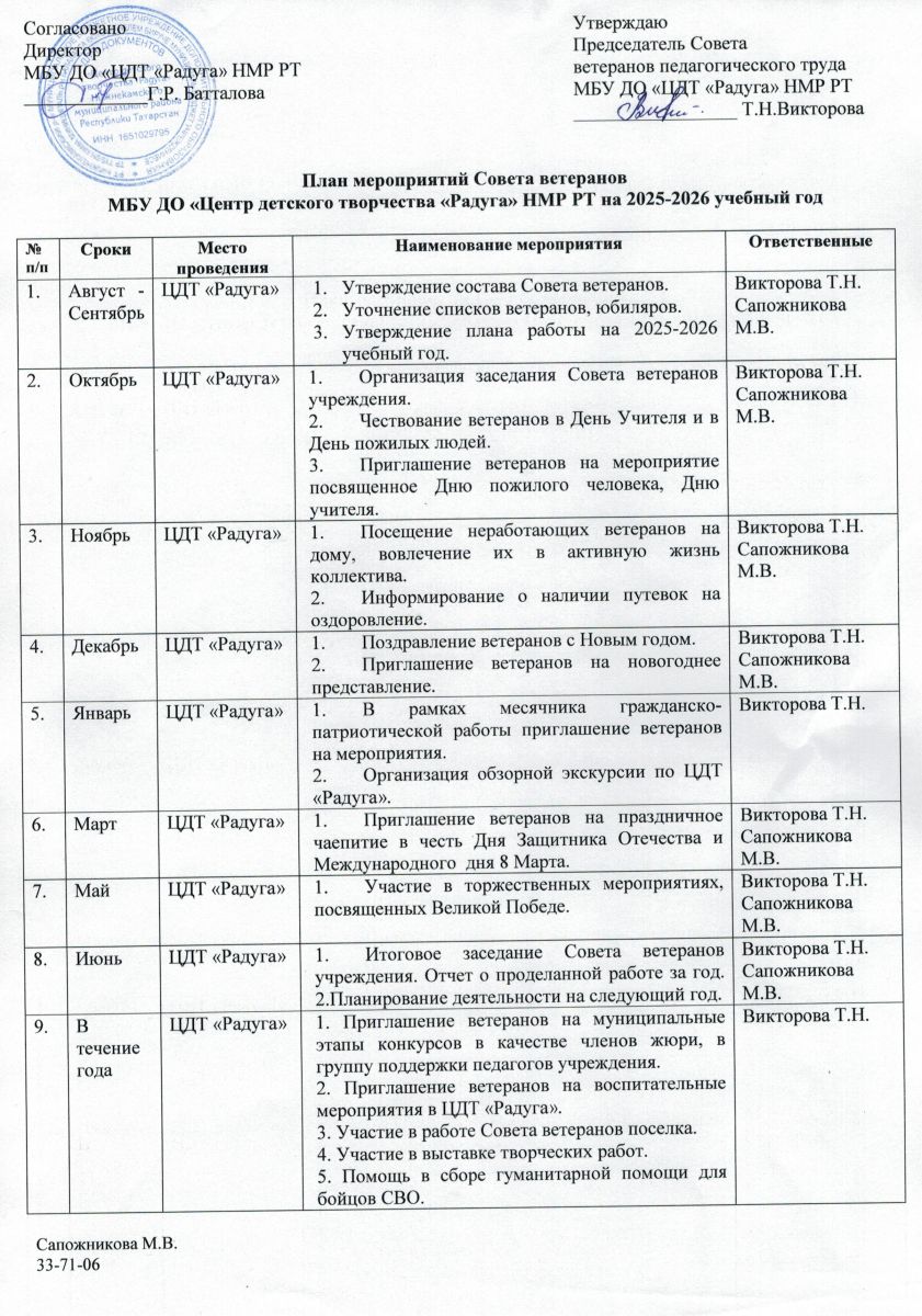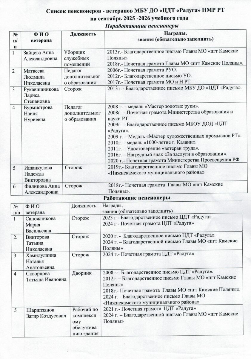 Список пенсионеров-ветеранов МБУ ДО ЦДТ "Радуга" НМР РТ на сентябрь 2025-2026 учебного года
