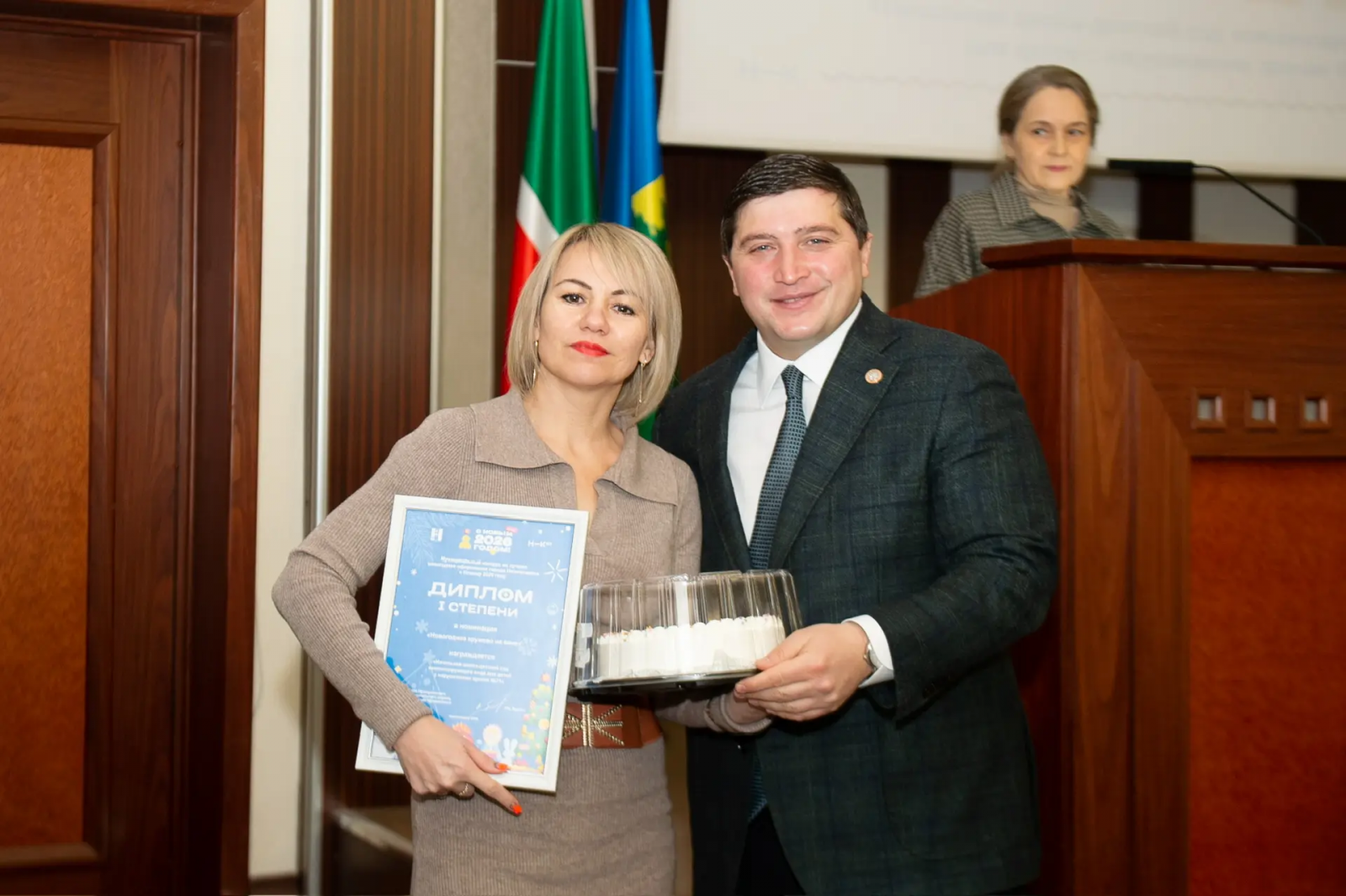 В декабре месяце Исполнительным комитетом НМР РТ был объявлен муниципальный конкурс На лучшее оформление к Новому - 2026 году.Конкурс включал в себя 8 номинаций. Мы выбрали для себя одну из них и не прогадали! В номинации "Новогоднее кружево на окне" нам не было равных в городе. На «Деловом понедельнике» глава НМР Радмир Беляев вручил нашему директору Груздевой Наталье Геннадьевне сладкий приз и диплом I степени!