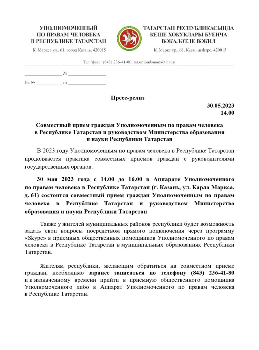 30 мая 2023 года с 14.00 до 16.00 в Аппарате Уполномоченного по правам человека в Республике Татарстан (г. Казань, ул. Карла Маркса, д. 61) состоится совместный прием граждан Уполномоченным по правам человека в Республике Татарстан и руководством Министерства образования и науки Республики Татарстан.