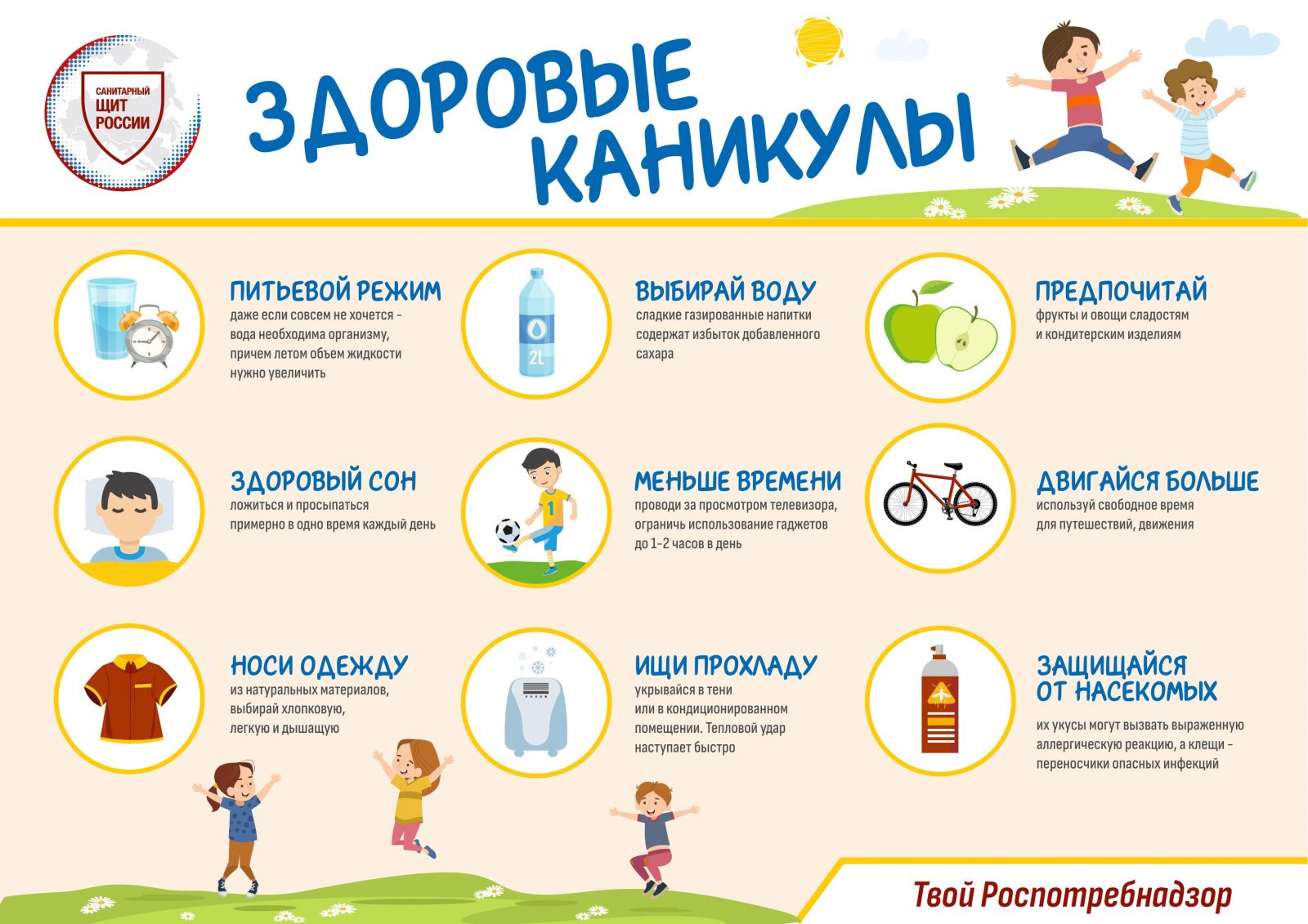 Лето — самое короткое и долгожданное время года для детей и их родителей. Пока есть возможность, хочется успеть всё: вволю погулять, искупаться, покататься на велосипеде, и заняться другими увлекательными делами, на которые зимой никогда не хватает времени. А чтобы долгие каникулы не омрачились травмами и болезнями — достаточно соблюдать простые правила безопасности: