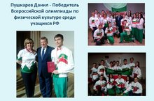 С 15 по 21 апреля в г. Ульяновск проходил региональный этап Всероссийской олимпиады среди школьников по физической культуре. В составе сборной команды Республики Татарстан были и ученики нашей школы Бликин Алексей (11 класса), Мартьянова Алина (11 класс) и Пушкарев Данил (10А класс). Ребята показали свои теоретические знания по физкультуре, умения в гимнастике, легкой атлетике, баскетболу, прошли полосу препятствий. В упорной борьбе, успешно пройдя все испытания, Пушкарев Данил стал победителем Всероссийской Олимпиады по физической культуре среди школьников. Мы горячо поздравляем Данила с этой победой и его наставника учителя физической культуры Полячихину Ольгу Викторовну.
