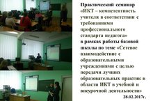 В рамках работы базовой школы по сетевому взаимодействию с образовательными организациями с целью передачи лучших образовательных практик в области ИКТ в учебной и во внеурочной деятельности 28.02.2017г. на базе МБОУ «СОШ №10» НМР РТ прошёл практический семинар учителей и заместителей директоров по учебной работе СОШ № 3, 8, 10, 31, гимназии 32, Татарстанского кадетского корпуса по теме «ИКТ – компетентность учителя в соответствии с требованиями профессионального стандарта педагога».