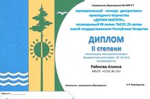 Поздравляем Раймову Алину, ученицу 7 А класса, получившую ДИПЛОМ II степени в номинации «Бисероплетение» (возрастная категория 10 – 13 лет) муниципального конкурса декоративно-прикладного творчества «ДОЧКИ-МАТЕРИ», посвященного 95-летию ТАССР, 25-летию новой государственности Республики Татарстан.