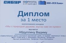 Абдуллин Вадим, ученик 10 класса, стал победителем в экологическом конкурсе «Мы с природой дружим, мусор нам не нужен», который был проведён при поддержке социальной программы ПАО «СИБУР Холдинг» «Формула хороших дел». Он представил проект «Сравнительный анализ состояния окружающей среды на примере загрязнения почвы», выполненнный под руководством учителя географии Капёрской О.В.