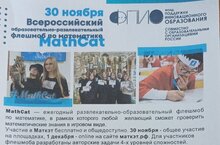 30 ноября по всей России прошёл XI ежегодный развлекательно-образовательный флешмоб по математике MathCat (Маткэт). MathCat - это первый в России развлекательно-образовательный флешмоб по математике, в рамках которого может проверить свои знания по математике любой желающий: и стар и млад. Участие в MathCat бесплатно и общедоступно.