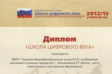Дипломом "Школа цифрового века" награждено МБОУ "Средняя общеобразоватедьная школа №10 с углубленным изучением отдельных предметов" г. Нижнекамска Республики Татарстан