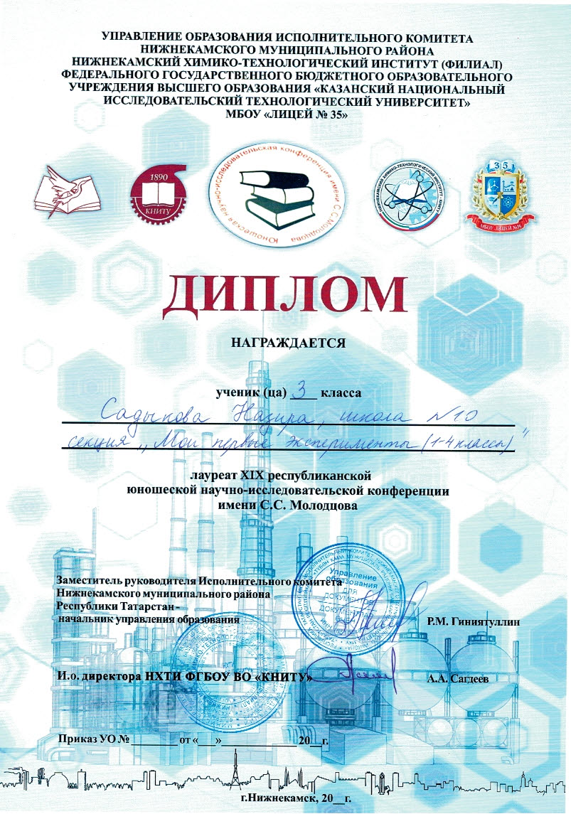 Ученица 3 А класса Садыкова Назира стала лауреатом XIX республиканской юношеской научно-исследовательской конференции имени С.С. Молодцова, который проходил 19.02.2021 г в НХТИ. Назира выступала в секции "Мои первые эксперименты". Поздравляем и желаем дальнейших открытий и побед!