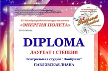 Ученица 9А класса Павловская Диана стала лауреатом 1 степени VII Международного конкурса талантов "Энергия полета"! От всей души поздравляем Диану и ее руководителя, педагога дополнительного образования, руководителя школьной театральной студии "Вообрази", Хмырову Эльмиру Борисовну и желаем дальнейших успехов!