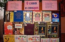В рамках Декады родного языка в библиотеке в игровой форме прошел урок «Мы путешествуем, друзья, по словарям от А до Я» с учащимися 8 А класса. Цель урока: дать представление о многообразии словарей, показать их назначение и область применения, способствовать формированию умений пользоваться словарями. Класс был поделен на шесть команд, у всех были разные задания. Учащиеся работали со словарями антонимов, синонимов, словарём иностранных слов, топонимическим словарём, словообразовательным и толковыми словарями. С увлечением учащиеся выполняли задания, искали ответы на вопросы. Была оформлена выставка «О словах и словарях», посвященная Владимиру Ивановичу Далю.