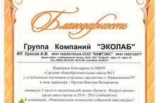 Группа Компаний "Эколаб" провела экологическую акцию "Бумаге - вторую жизнь" среди школ города. За 2014-2015 учебный год в номинации "Максимальное количество собранной макулатуры" 1 МЕСТО заняла наша школа. Поздравляем всех учащихся и их родителей, которые собрали более 4-х тонн макулатуры. Наша общеобразовательная организация была награждена Благодарственным письмом и получила в подарок ксерокс Canon
