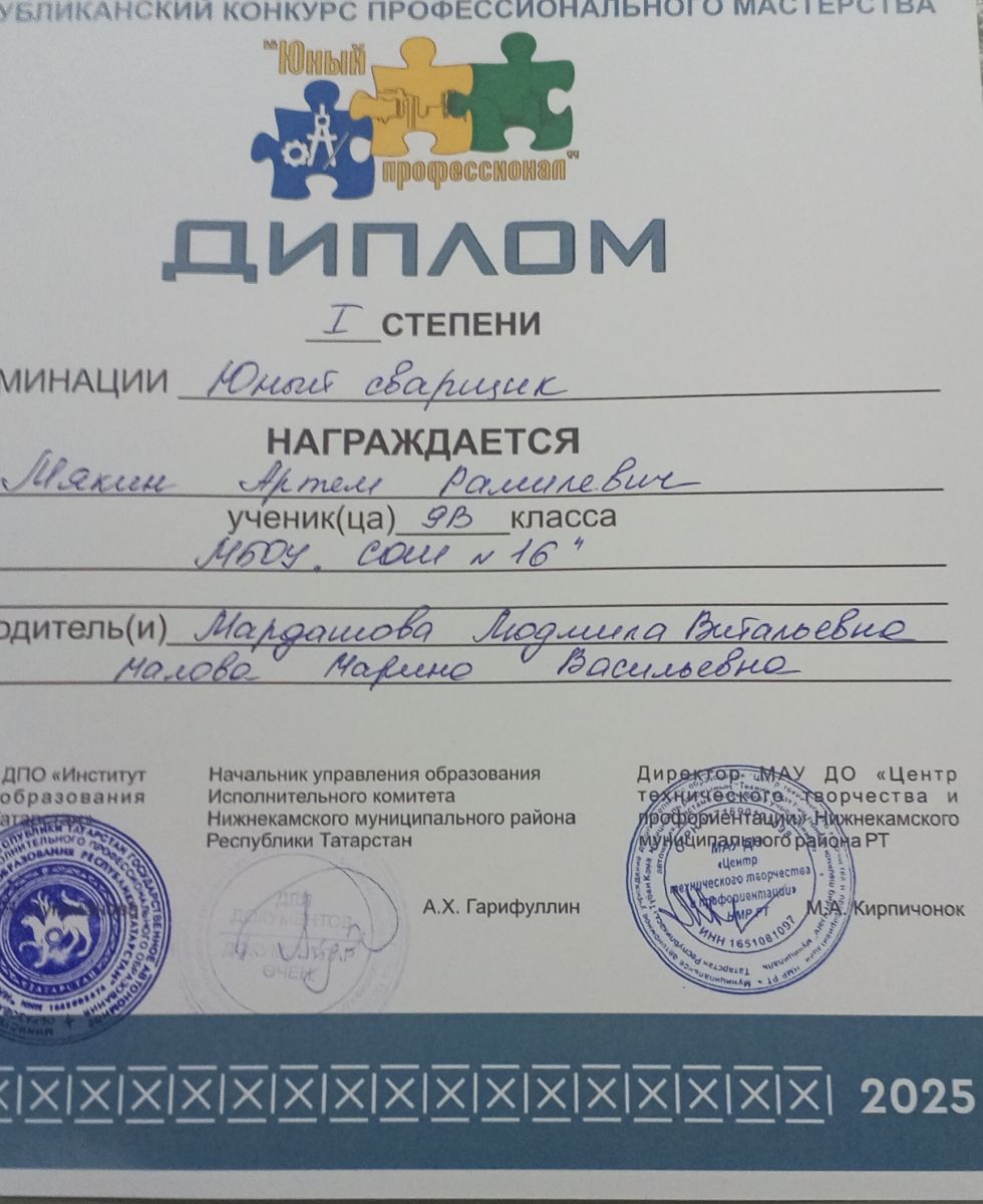 12 ноября прошёл республиканский конкурс профессионального мастерства " Юный профессионал ", в котором приняли активное участие ребята 9В класса: Горюшов Родион, Норкин Глеб, Мякин Артем. По итогам конкурса в номинации " Юный сварщик " Мякин Артем занял 1 место, Норкин Глеб, Горюшов Родион получили сертификаты участников. Поздравляем всех ребят с достойным выступлением! Мы гордимся вами!!!
