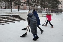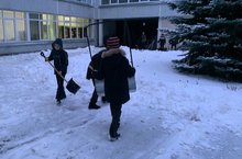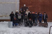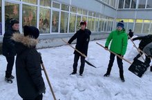 Вот такой большой компанией: учителя, родители и дети. Ученики 7-х классов выходят на уборку снега на территории любимой школы