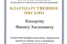 Кадыров Фанис Хасипович, преподаватель Нижнекамской киношколы, награждён Благодарственным письмом от депутата Государственной Думы Айдара Метшина.