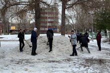 Почти миновал первый месяц весны, а снега на школьном дворе еще много. По уже сложившейся традиции, обучающиеся старших классов вышли на субботник. Ребята дружно раскидывали снег во дворе и возле здания.