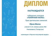 Поздравляем Юрова Малика, учащегося 8 класса А, победителя конкурса "Понятная наука" в номинации "Научно -популярное видео" Фильм Малика так понравился в Музее Мирового океана в Калининграде, что ему присудили Приз зрительских симпатий.
