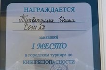 Поздравляем! Тухватуллин Ислам, обучающийся 7 класса Б, стал победителем в городском турнире по Кибербезопасности. Благодарим его руководителя Идиятуллина Булата Тагирович а за отличную работу!